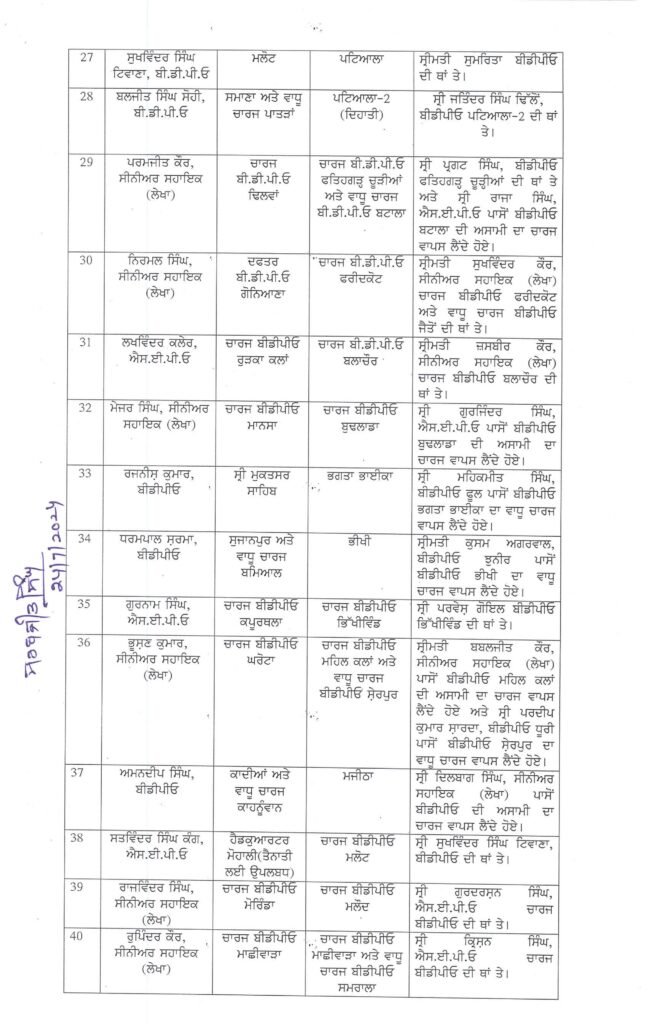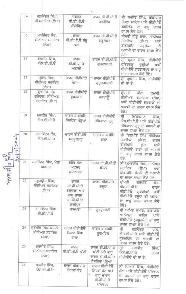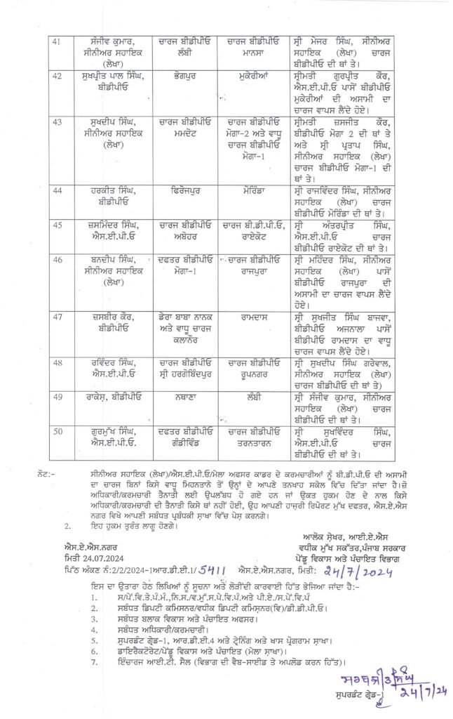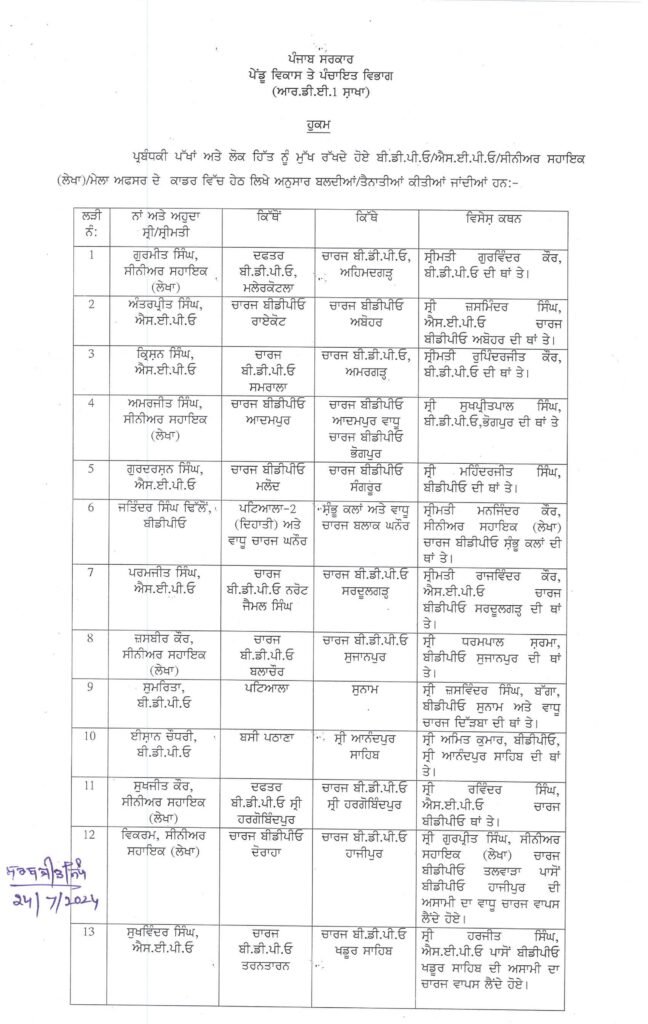 पंजाब सरकार ने 50 अफसरों का तबादला किया है। मुख्यमंत्री भगवंत मान के आदेश के बाद ग्रामीण विकास और पंचायत विभाग के 50 अफसरों का तबादला कर दिया। ये सभी कई साल से एक ही जगह पर तैनात थे। तबादले के बाद आदेश जारी किया गया है कि सभी अफसर अपनी नई जगह तत्काल ज्वाइन करें।