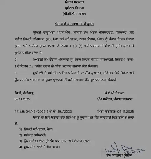 पंजाब सरकार ने मोगा की एडीसी और नगर निगम कमिश्नर चारूमिता को सस्पेंड कर दिया है। इस संबंध में चीफ सेक्रेटरी केएपी सिन्हा ने गुरुवार को आदेश जारी किए हैं। आदेश में पंजाब सिविल सर्विसेज (सजा एवं अपील) रूल्स 1970 का हवाला दिया गया है।