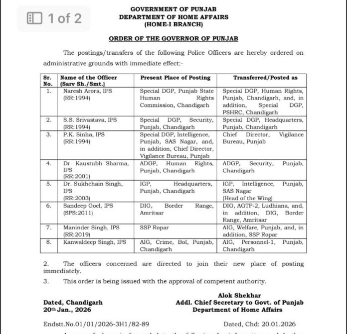 पंजाब सरकार ने आज प्रशासनिक स्तर पर बड़ा फैसला लेते हुए 8 आईपीएस अधिकारियों के तबादले किए हैं। जारी आदेशों के अनुसार वरिष्ठ आईपीएस अधिकारी पीके सिन्हा को विजीलेंस ब्यूरो का नया चीफ डायरेक्टर नियुक्त किया गया है। वहीं सुखचैन सिंह गिल को आईजी हेडक्वार्टर के पद से हटाकर आईजी इंटेलिजेंस, पंजाब की अहम जिम्मेदारी सौंपी गई है।