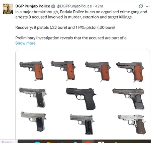पंजाब पुलिस ने ऑर्गेनाइज्ड क्राइम के खिलाफ बड़ी कार्रवाई करते हुए पटियाला से हत्या, फिरौती और टारगेट किलिंग में शामिल 9 आरोपियों को गिरफ्तार किया है। पुलिस ने आरोपियों के कब्जे से 9 पिस्टल (32 बोर) और 1 PX5 पिस्टल (30 बोर) बरामद की है। शुरुआती जांच में सामने आया है कि आरोपी एक संगठित आपराधिक नेटवर्क का हिस्सा हैं और किसी बड़ी वारदात की योजना बना रहे थे। मामले में एफआईआर दर्ज कर ली गई है और जांच जारी है। इस कार्रवाई की जानकारी पंजाब के डीजीपी ने सोशल मीडिया पोस्ट के जरिए दी है।